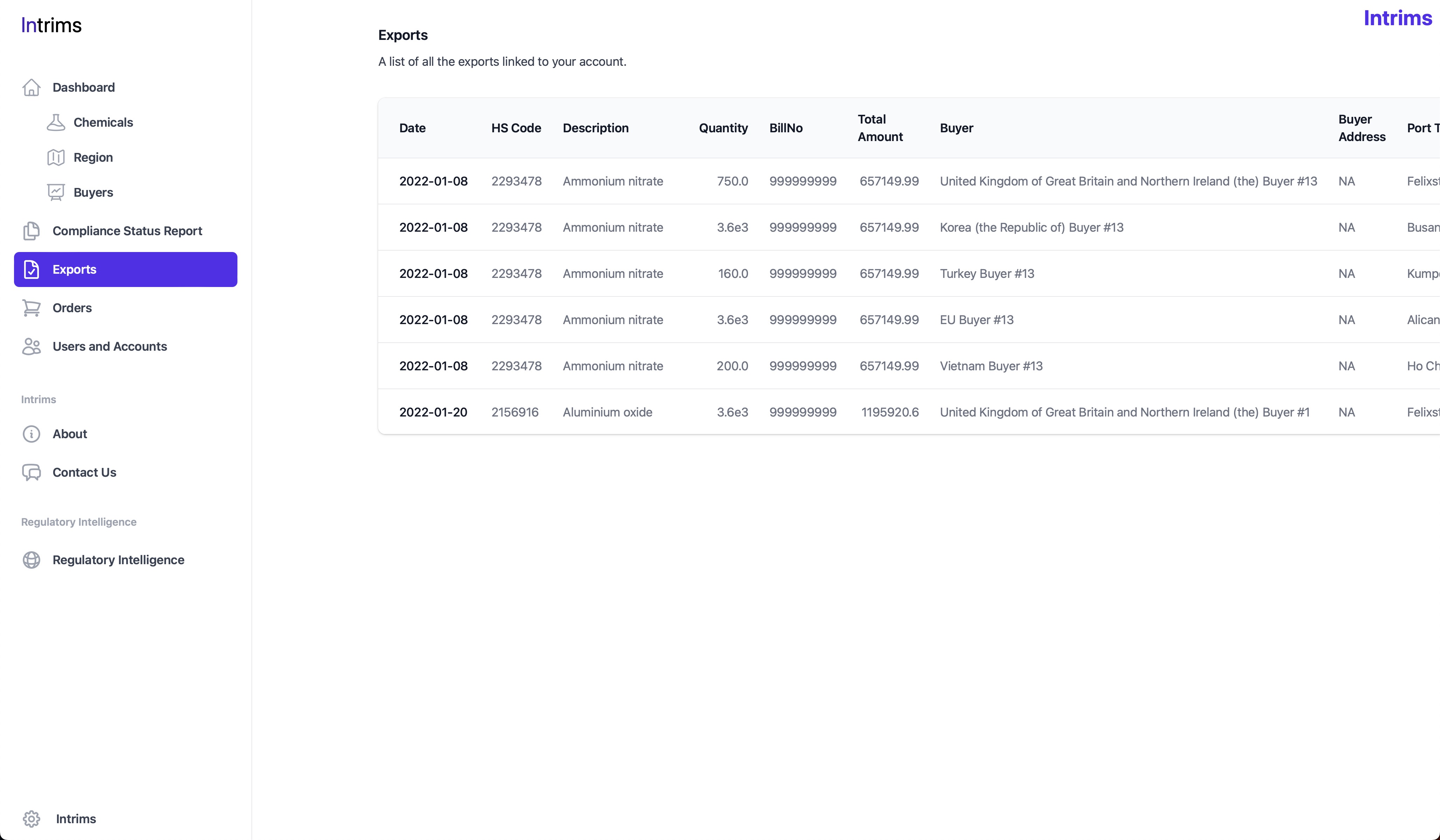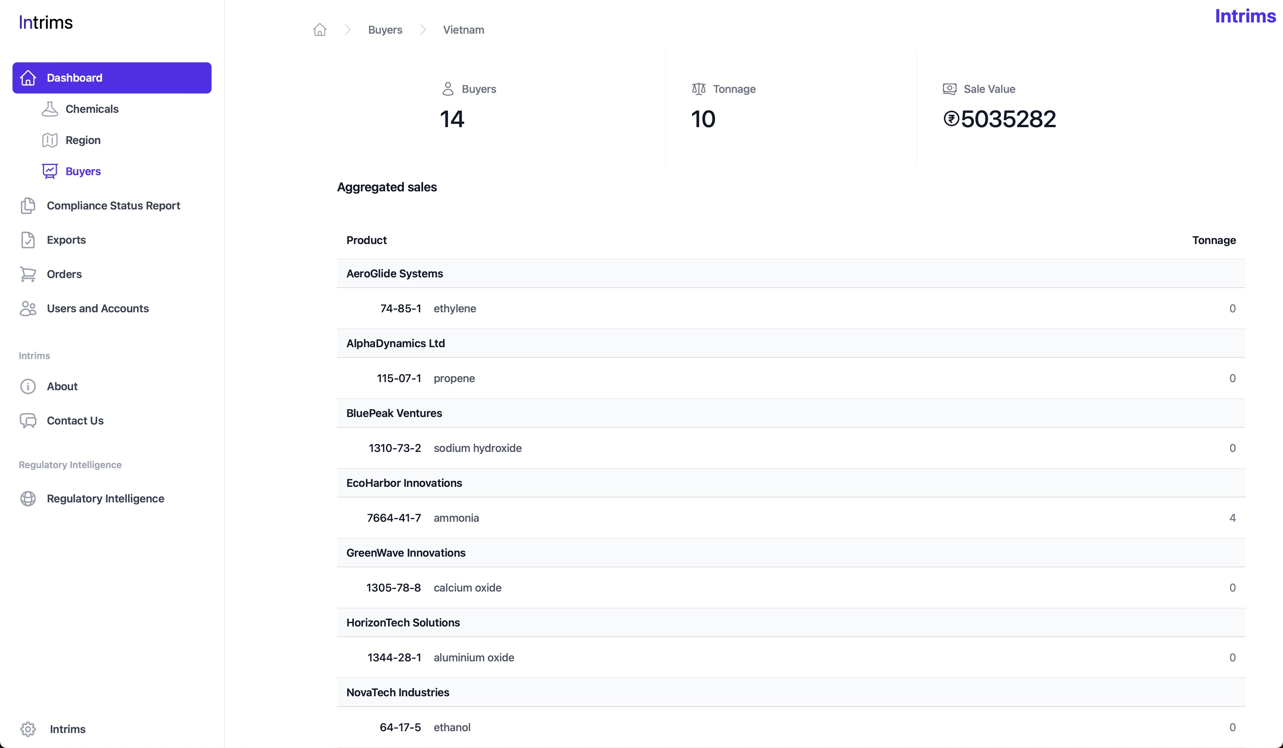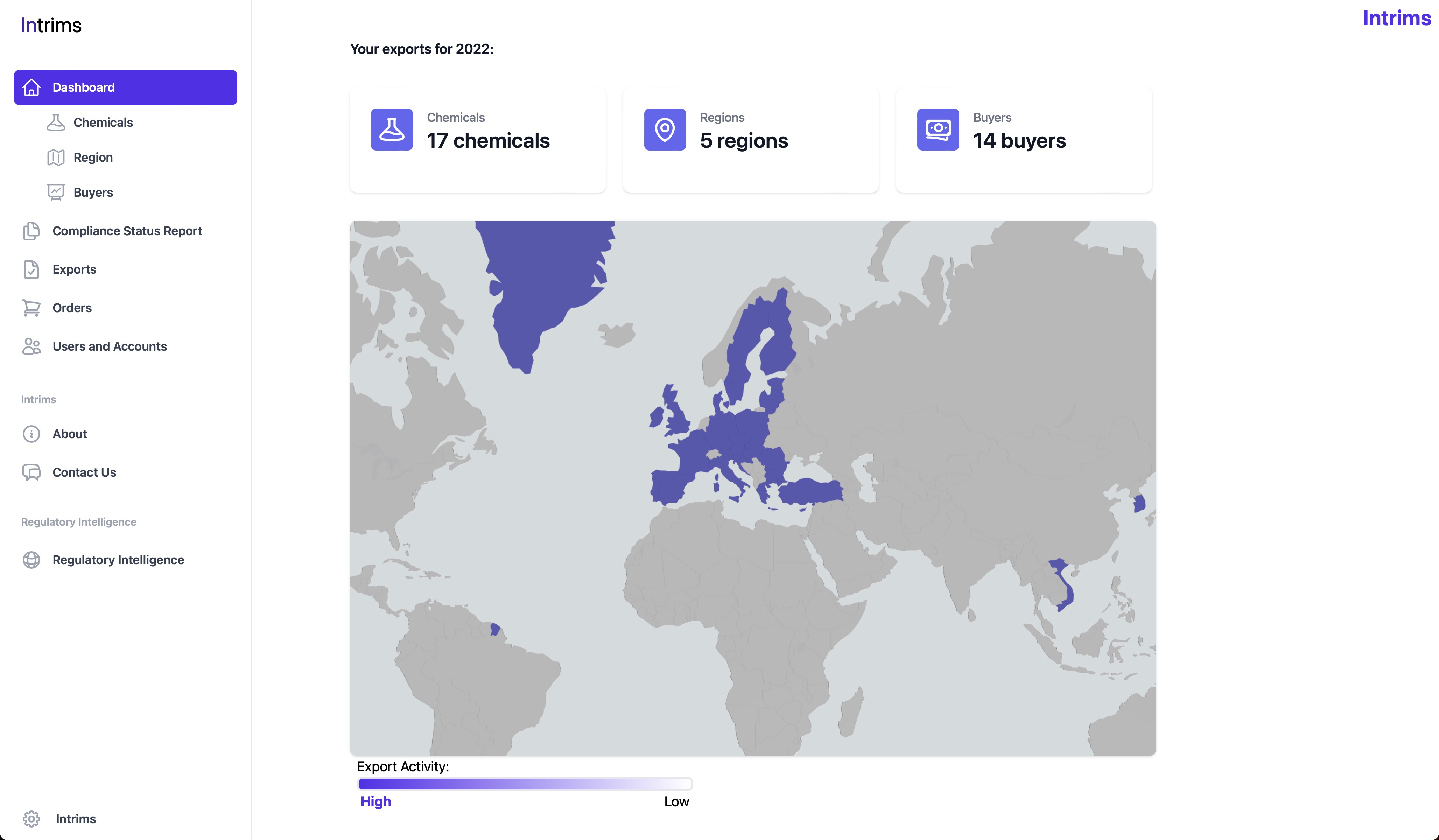 Will provide you with an overview of the total amount of your exports. You will be able to see the quantity of chemicals exported, the number of regions involved in your exports, and the count of your buyers.